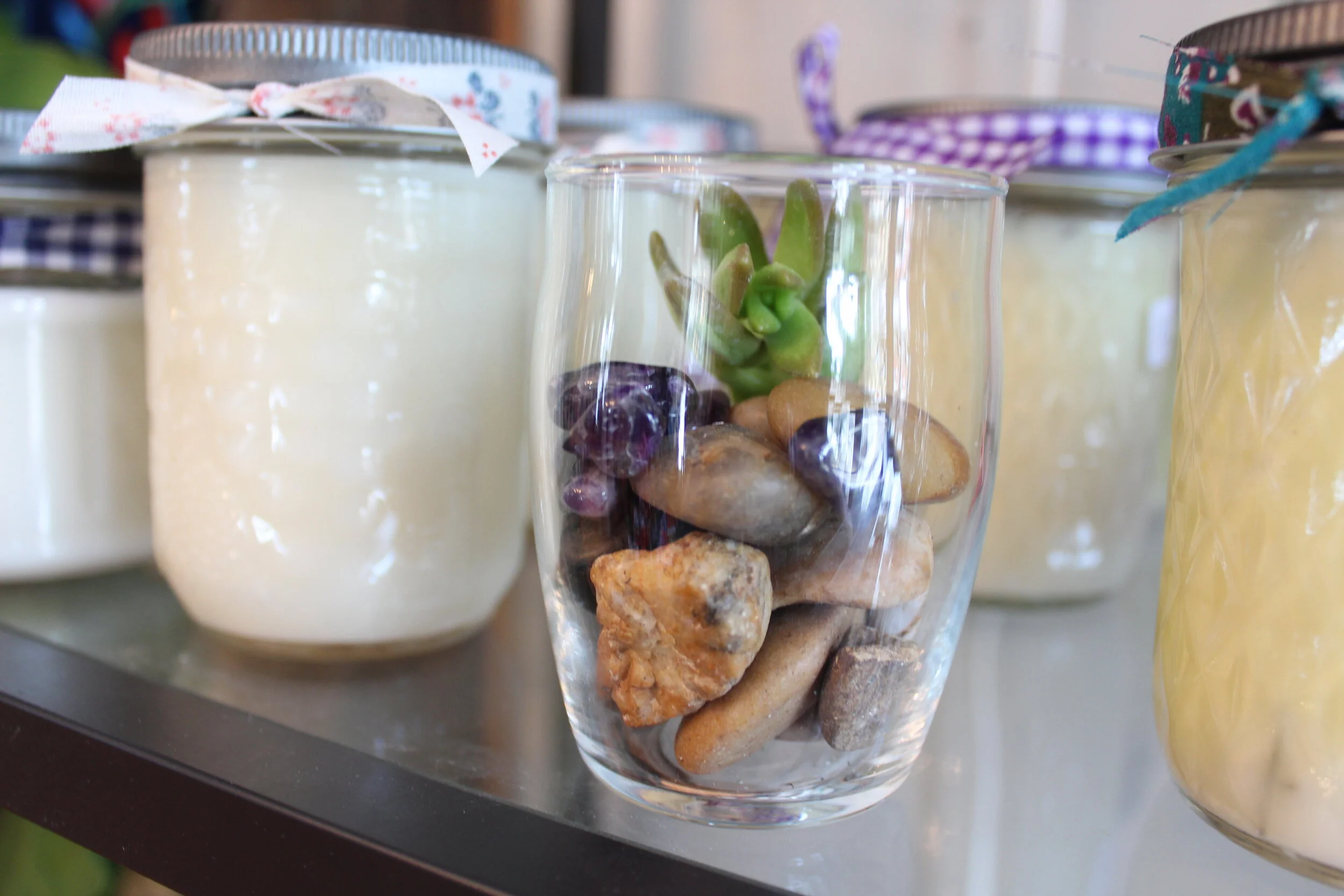 Make a planter. Place succulents, herbs, or even dried or faux flowers in your container. You can also add pebbles or crystals.